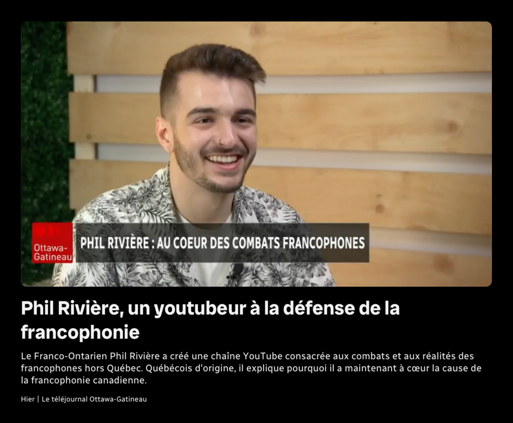 J’aimerais lancer un énorme merci au RPFO, à l’ACFO Ottawa, à ma maison de production et à toute la communauté franco-ontarienne de mettre mon travail en valeur de cette manière! En recevant le Prix Huguette-Parent, j’espère ouvrir des portes pour d’autres jeunes francos et motiver plus de gens à s’impliquer. Ce prix, c’est la preuve que les YouTubeurs peuvent en accomplir, des choses!